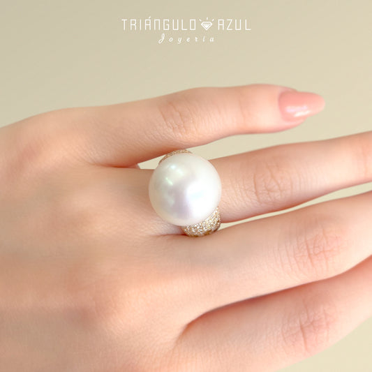 Anillo con Perla de 1.50cm y Diamantes con 1.12 CTS Total en Oro Amarillo de 14K