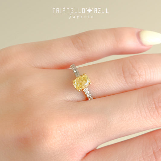 Anillo de Compromiso con Diamante Canario Central de 1.01 CTS FY SI2 NON CERT + Laterales de 0.56 CTS Total en Oro Blanco y Amarillo de 18K