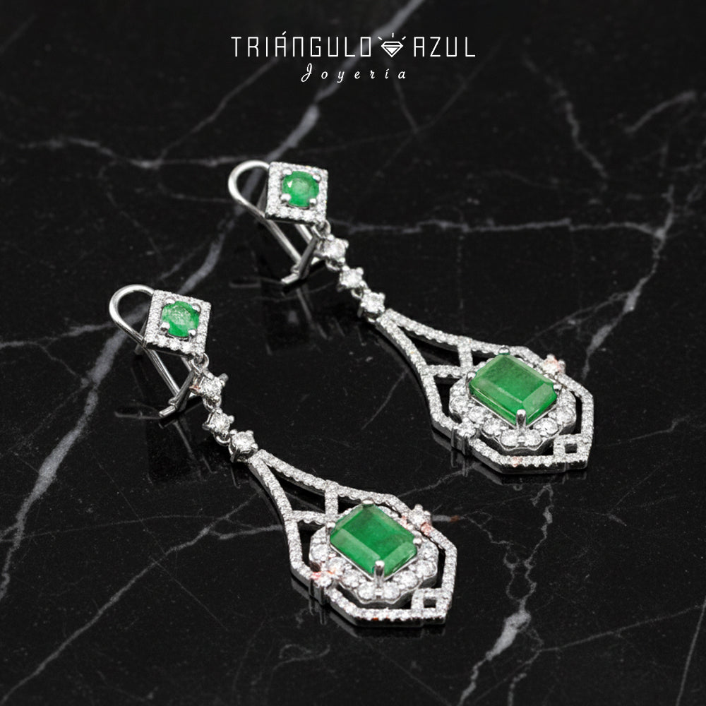 Aretes Largos de Esmeralda con 4.01 CTS Total y Diamantes con 2.35 CTS Total en Oro Blanco de 14K